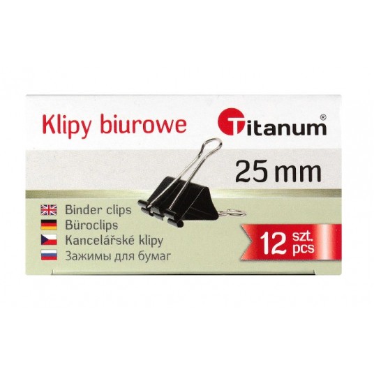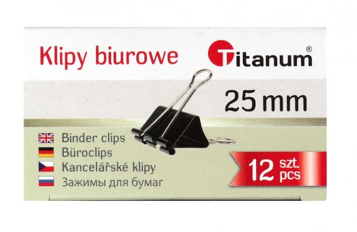 - klipy biurowe do spinania papieru - metalowe - rozmiar: 25 mm - kolor: czarny - opakowanie: 12 sztuk