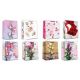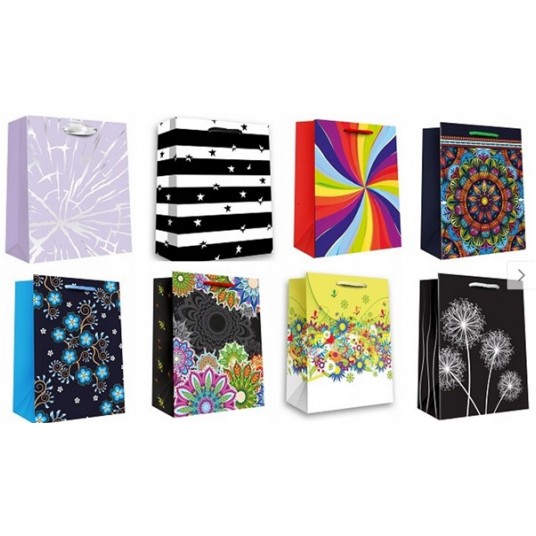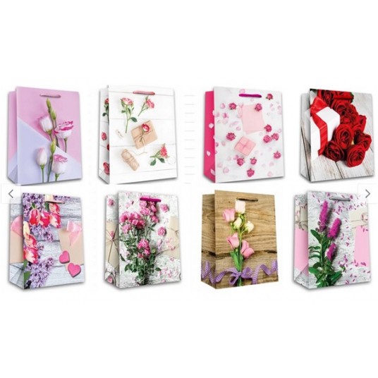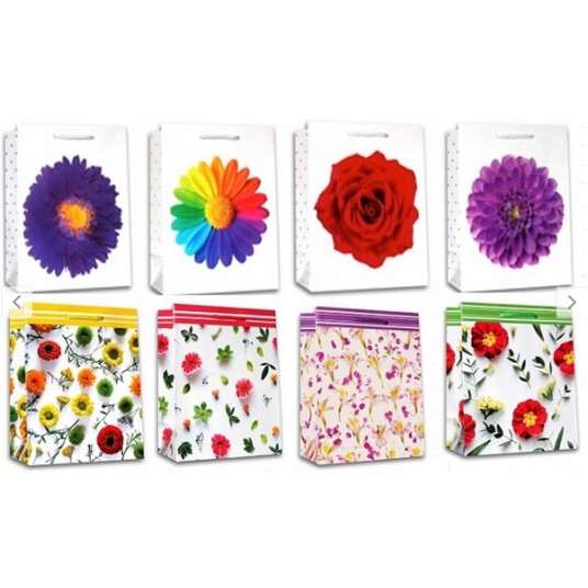 Torebka ozdobna z bilecikiem, romiar: DUŻA. Występuje w różnej tonacji kolorystycznej (kwiaty, figury, itp...) 12 sztuk w opakowaniu.