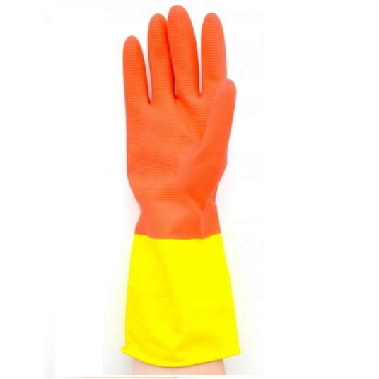 Rękawice gospodarcze, supermocne MASTER. Rozmiar M, czerwono-żółte, długie, kauczykowe. Sprzedawane na sztuki, 144 sztuki w opakowaniu zbiorczym.
