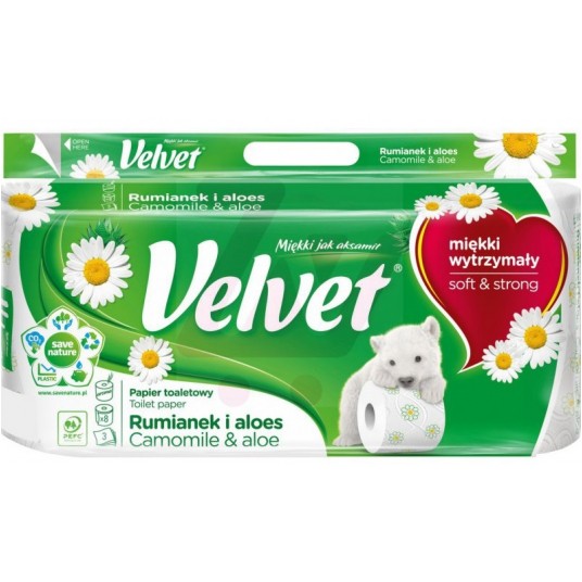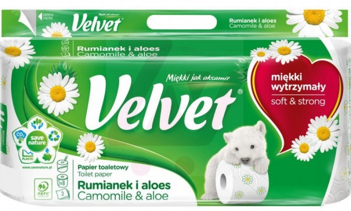 Papier toaletowy Velvet Rumianek i Aloes, wykonany z trzech warstw delikatnej bibułki, jest miękki i ma łagodny, inspirowany naturą zapach. Dzięki eleganckim tłoczeniom oraz nadrukowi stanowi też idealną dekorację Twojej łazienki.