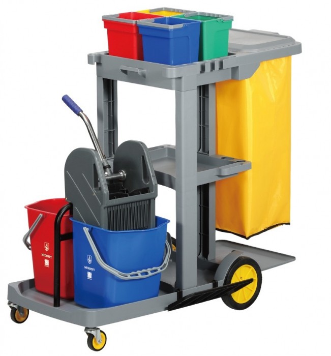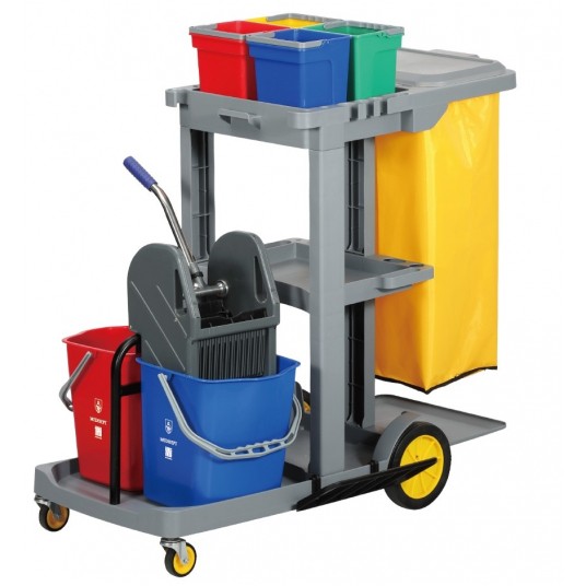 Zestaw sprzątający IM-SPR-0521 składający się z wózka dwuwiaderkowego z prasą, kuwet i uchwytów na mopy, worka.
