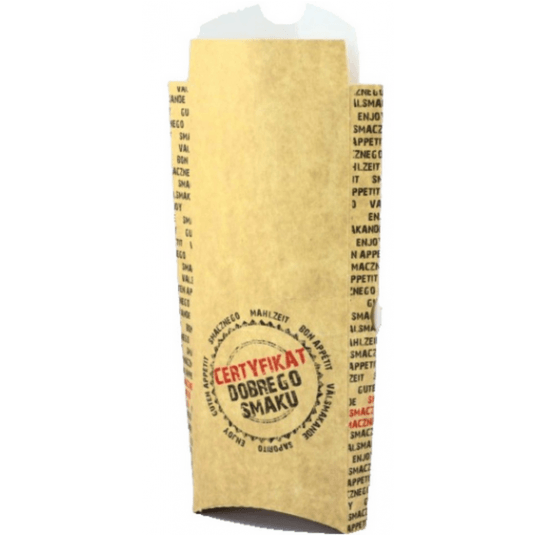 Opakowanie z tektury litej o rozmiarach, doskonałe na kanapkę typu wrap/tortilla z wygodną perforacją. Karton należy do serii z nadrukiem „Certyfikat dobrego smaku”, przeznaczony jest dla punktów gastronomicznych i restauracji.