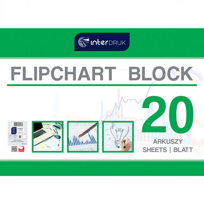 Blok do flipchartów gładki. Liczba kartek: 20. 5 otworów do zawieszenia. Papier offsetowy 80 g. Wymiary: 64 x 100 cm.