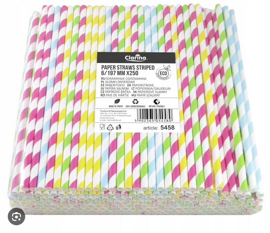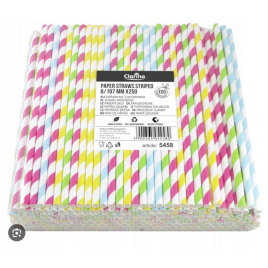 Słomka papierowa 6x197mm PASKI MIX CLARINA 250szt