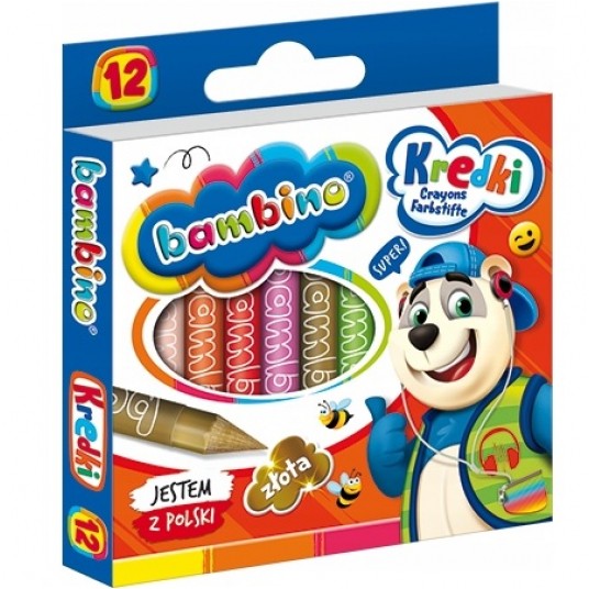 Wysokiej jakości kredki, które towarzyszą dzieciom od pokoleń. Wyróżniają je wyjątkowo intensywne i nasycone kolory oraz doskonale krycie powierzchni. Idealnie nadają się do rysowania, wypełniania dużych płaszczyzn i wykonywania miękkich przejść pomiędzy kolorami. Kredki Bambino wykonane są z glinki kaolinowej, co nieporównywalnie podnosi ich walory użytkowe względem kredek świecowych, woskowych czy ołówkowych. Każda kredka posiada papierową ochronną owijkę z własną grafiką (na każdej kredce inne zwierzątko). Kredki Bambino są bezpieczne dla dzieci, ich produkcja odbywa się w Polsce.
