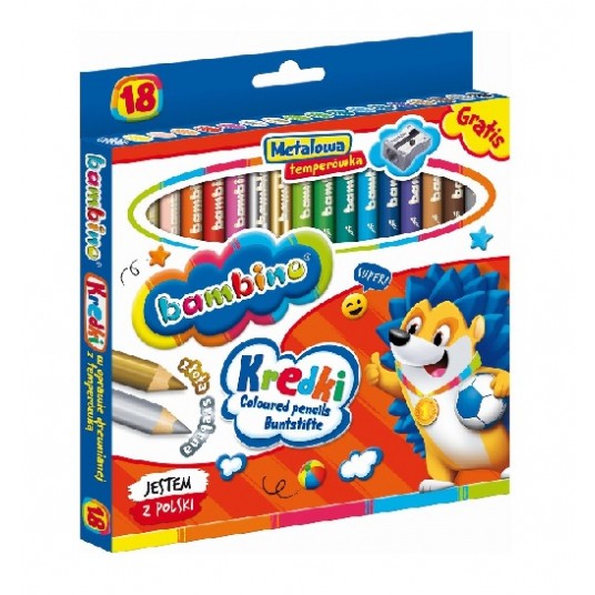 -Licencja BAMBINO -Ilość kolorów 18 -Ilość sztuk w opakowaniu 18 -Cechy szczególne Kredki o przekroju 7 mm, z temperówką w zestawie.