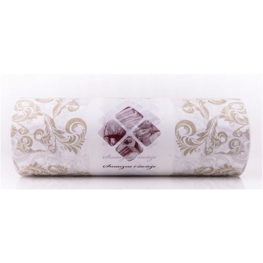 Papier charakteryzuje się eleganckim zdobieniem i nadrukiem. Nadruk zawiera tort, ciasto oraz napis "smaczne i świeże". Wzornictwo oraz użyte kolory są ozdobne i eleganckie, z pewnością wpłyną pozytywnie na wizerunek firmy. W papier możesz owinąć ciasta, torty, ciasteczka bez konieczności używania opakowań z tworzyw sztucznych. Papier nie jest powlekany warstwą PE co sprawia, ze jest ekologiczny i łatwy do utylizacji.