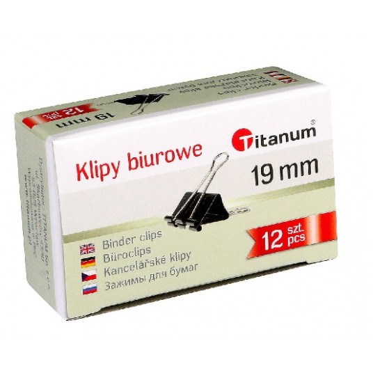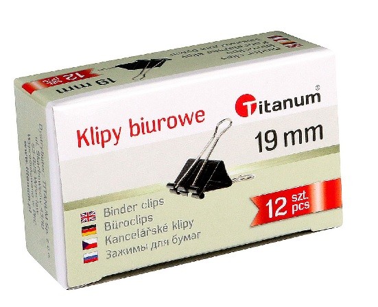 - klipy biurowe do spinania papieru - metalowe - rozmiar: 19 mm - kolor: czarny - opakowanie: 12 sztuk
