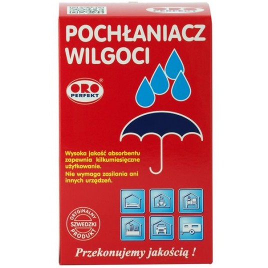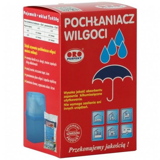 ZAPOBIEGA: gromadzeniu się wilgoci, powstawaniu nieprzyjemnych zapachów, powstawaniu pleśni. Wysoka jakość chemicznego absorbentu zapewnia kilkumiesięczne użytkowanie. Nie wymaga zasilania ani innych urządzeń. Pojemnik + wkład 1x450g. Pochłaniacz AbsoDry składa się z worka higroskopijnych kryształów umieszczonego w misce zbierającej wodę. Działanie rozpoczyna się natychmiast po usunięciu zewnętrznej folii i umieszczeniu worka w misce zbierającej (prosimy zobaczyć rysunki). Kryształy pochłaniają nadmiar wilgoci do optymalnego poziomu 50%. Pochłaniacz działa bez podłączania do prądu. Gdy kryształy zużyją się, zebraną wodę można po prostu wylać do WC, a worek wyrzucić do zwykłych odpadów gospodarczych. Aby pochłaniacz znów działał wystarczy uzupełnić miskę zbierającą oryginalnym wkładem AbsoDry Jeden wkład wystarcza na około 3 miesiące dla pomieszczenia o kubaturze 35 m3 w zależności od temperatury i wilgotności.
