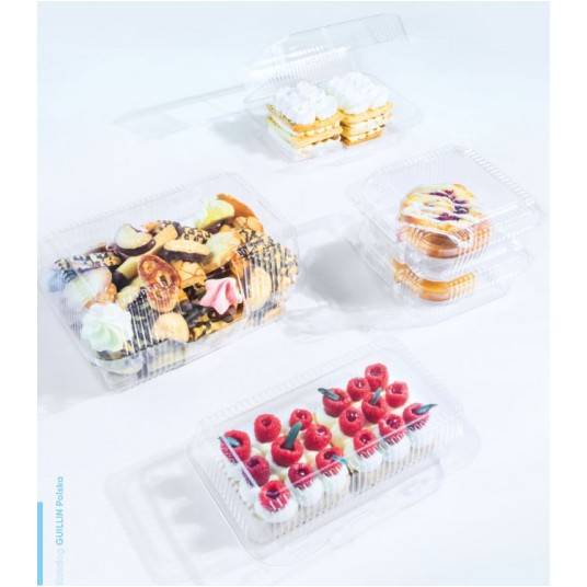 Pojemniki prostokątne, dwuczęściowe, zespolone. Idealne do pakowania wyrobów cukierniczych.