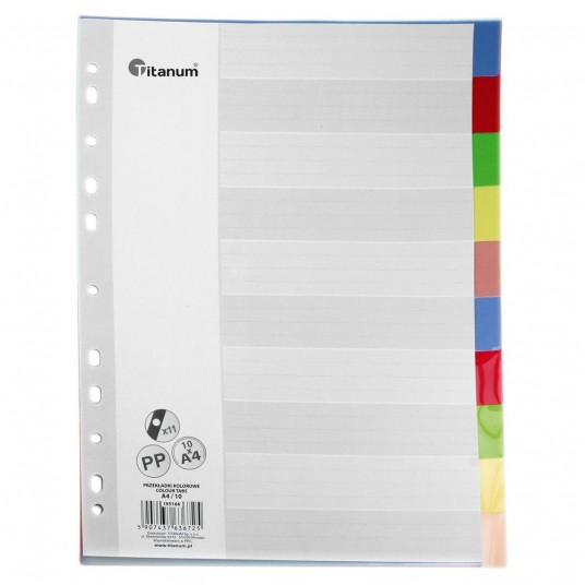 - wykonane z nieprzezroczystej, polipropylenowej folii - opisowa strona tytułowa - uniwersalna perforacja pasująca do każdego segregatora - kolorowe z czystymi indeksami - 10 kolorów