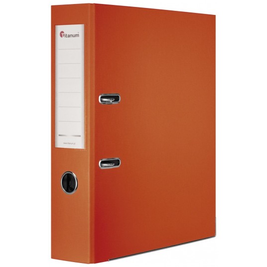 - wykonane z twardej tektury pokrytej folią polipropylenową - wewnątrz wyklejka papierowa - mechanizm dźwigniowy z dociskiem - na grzbiecie otwór ułatwiający wyjmowanie segregatorów z półki - dolna krawędź wzmocniona metalowym okuciem - wymienna obustronna etykieta do opisu - kolor pomarańczowy