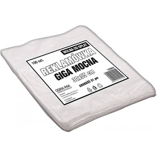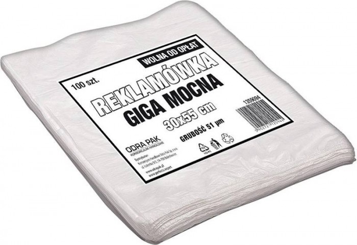 Reklamówka Giga Mocna wykonana z grubej folii HDPE. Dużo wytrzymalsza wersja popularnej "zrywki". Przeznaczona do wielokrotnego użytku. Przydatna w każdym sklepie.