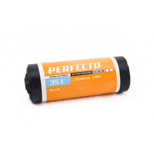 Worki na odpady Perfecto zostały wykonane z grubej folii LDPE. Worki z tej serii charakteryzuje pięciostopniowa skala wytrzymałości. Małe worki o pojemności 35L świetnie sprawdzą się na małych koszach łazienkowych i biurowych