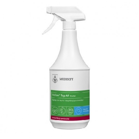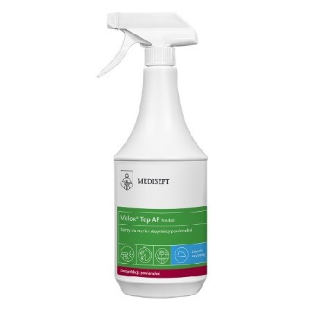 Velox Top AF zalecany jest do dezynfekcji końcówek stomatologicznych przed procesem sterylizacji oraz łyżek protetycznych i wycisków silikonowych. Preparat nie zawiera aldehydu i fenolu dzięki czemu nie odbarwia dezynfekowanych powierzchni. Dzięki innowacyjnej formule opartej na synergii surfaktanów i technologii nano-miceli produkt posiada szerokie spektrum bójcze i wyjątkowe właściwości myjące. Zalecany do dezynfekcji powierzchni blatów, unitów i podobnych. Preparat dostępny w dwóch wersjach zapachowych grapefruita z mandarynką oraz neutralny. Produkt posiada opinię producenta sprzętu medycznego w zakresie tolerancji materiałowej na tworzywo ABS i materiały obiciowe.