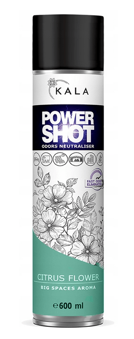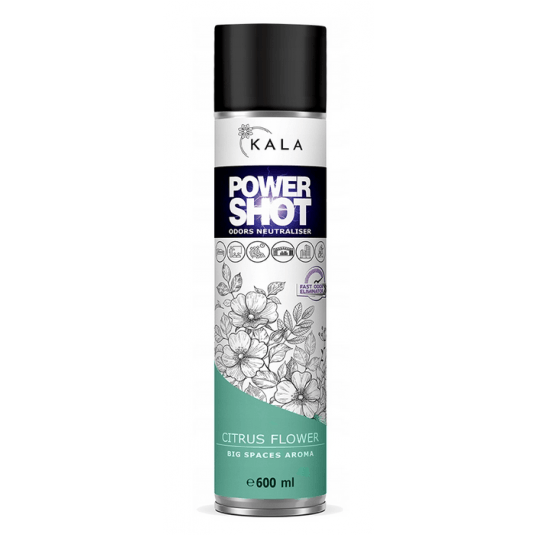 Neutralizator nieprzyjemnych zapachów, odświeżacz Kala POWER SHOT zapach CITRUS FLOWER (600 ml) to zapach, w którego składzie połączyliśmy zapachy kwiatowe oraz cytrusowe. CITRUS FLOWER to bardzo uniwersalny zapach, którego możliwości zastosowania są bardzo szerokie. Neutralizator nieprzyjemnych zapachów, to produkt z rewolucyjnym sposobem dozowania, dzięki któremu jedno naciśnięcie wentyla (ok 1 sekunda) neutralizuje nieprzyjemne zapachy oraz aromatyzuje około 200 m3. W składzie POWER SHOT obecne są substancje czynne, dzięki którym nieprzyjemne zapachy są neutralizowane a nie jak w przypadku większości odświeżaczy przykrywane. Wraz z neutralizacją nieprzyjemnych zapachów POWER SHOT zapewnia również aromatyzację przestrzeni jednym z 6 dostępnych w gamie POWER SHOT zapachów.