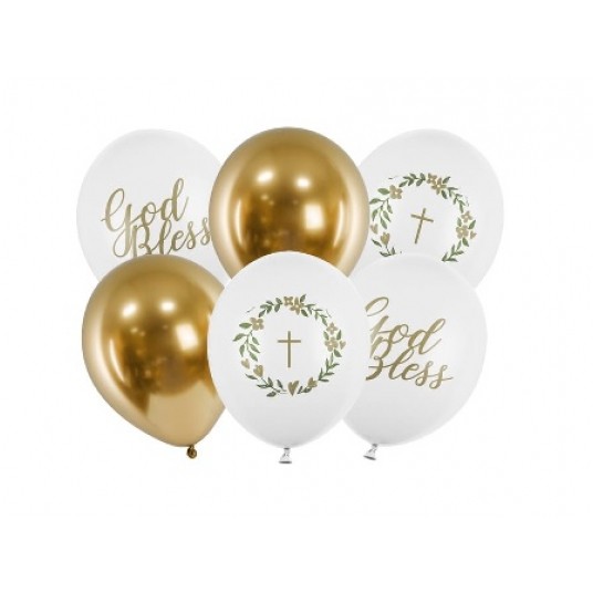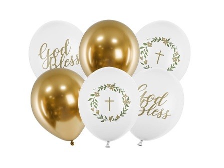 Balony lateksowe, 30cm, God Bless KOMUNIA/CHRZES, 6 sztuk w opakowaniu.