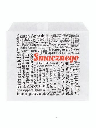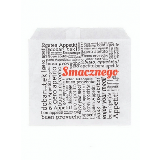 Koperta torebka na hamburger kebab, biały, 175X170, nadruk "SMACZNEGO"', 200 sztuk w opakowaniu, 10 opakowań w kartonie zbiorczym.