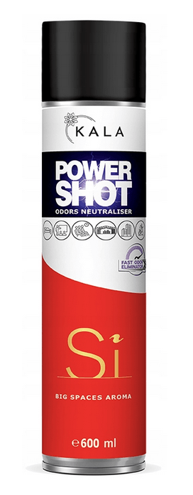 Neutralizator nieprzyjemnych zapachów, aromatyzer odświeżacz Kala POWER SHOT 600 ml to produkt z rewolucyjnym sposobem dozowania, dzięki któremu jedno naciśnięcie wentyla (ok. 1 sekunda) neutralizuje nieprzyjemne zapachy oraz aromatyzuje około 200 m3. W składzie POWER SHOT obecne są substancje czynne, dzięki którym nieprzyjemne zapachy są neutralizowane, a nie jak w przypadku większości odświeżaczy przykrywane. Wraz z neutralizacją nieprzyjemnych zapachów POWER SHOT zapewnia również aromatyzację przestrzeni jednym z dostępnych w gamie POWER SHOT zapachów.