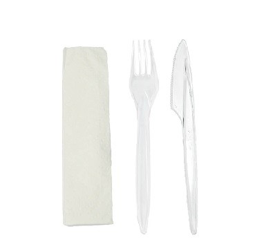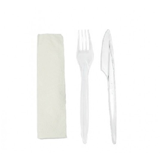 Zestaw sztućców przeźroczysty widelec, nóż serwetka zapakowany w sposób higieniczny ,serwetka składana dwuwarstwowa o rozmiarze 33cm. na 33cm. Idealny dla wszelkiego rodzaju branży gastronomicznej gdzie serwowane są dania na wynos, 250 sztuk w kartonie.