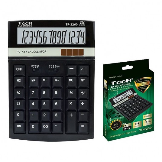 – wyświetlacz 14-pozycyjny – pamięć – obliczanie procentu – obliczanie pierwiastka – marża/obniżka – suma ogólna – wybór trybu przecinka i ilości miejsc po przecinku – klawisz zmiany znaku – klawisz podwójnego zera – klawisz cofania ostatniej cyfry – kasowanie ostatniej pozycji – całkowite kasowanie rejestrów i pamięci – ruchomy wyświetlacz – zasilanie bateryjne i słoneczne – zgodny z wymaganiami UE – rozmiar: 200x140x23 mm – dożywotnia gwarancja – instrukcja obsługi