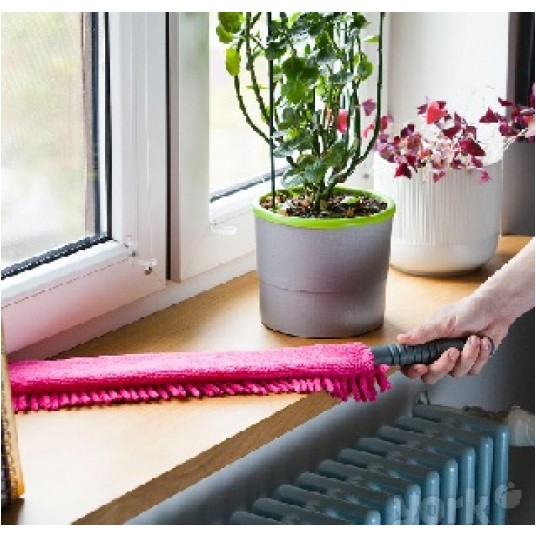 Miotełkę do kurzu cechuje niezwykła elastyczność i poręczność. Dopasowuje się do faktur i kształtów zakurzonych powierzchni, które wymagają czyszczenia. Dzięki specjalnej konstrukcji pozwala na szybkie i sprawne dotarcie do trudno dostępnych miejsc. Miotełka została zaprojektowana w ten sposób, że jedna strona przeznaczona jest do czyszczenia, natomiast druga do wycierania i polerowania. Można używać jej zarówno na sucho, jak i na mokro. Mikrofibra działa jak magnes, chwyta brud i zachowuje go wewnątrz tkaniny aż do momentu wypłukania, a także umożliwia skuteczne sprzątanie bez użycia detergentów. Kolejnym atutem jest możliwość prania mikrofibrowej nasadki w pralce, bez użycia środków zmiękczających. Produkt nadaje się do wielokrotnego użytku.