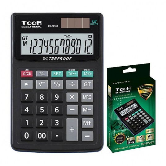 Kalkulator biurowy TR-2296 T •kalkulator 12-pozycyjny •funkcja zmiany znaku •klawisz cofania ostatniej cyfry •funkcja obliczania podatku -funkcja kasowania ostatniej pozycji •funkcja sumy ogólnej •funkcja pierwiastkowania •funkcja pamięci •obliczanie procentu liczby •2 typy zasilania •WODOODPORNY! Wymiary: 158 x 106 x 40 mm