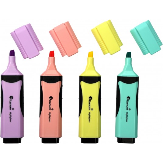 Zestaw 4 zakreślaczy w kolorach pastelowych. Ścięta końcówka, grubość linii pisania 1-5 mm. Pakowane w wygodne przeźroczyste etui zamykane na zatrzask.