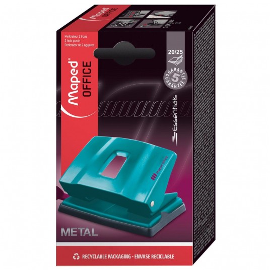 Dziurkacze metalowe ESSENTIALS METAL do 25 kartek ? metalowy mechanizm ? precyzyjny, regulowany ogranicznik formatu ? opatentowany sposób dziurkowania bez użycia listwy formatowej umożliwiają wgłębienia w tylnej części podstawy zgodne z rozstawem ringów w segregatorze ? łatwy do opróżniania pojemnik na konfetti ? wskaźnik środka strony ?