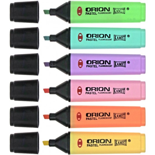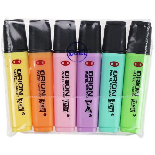 -zakreślaczpsastelowe -z tuszem pastelowym nierozmazującym się, na bazie wody -duża odporność na wysychanie -do pisania na wszystkich rodzajach papieru (również faksowym i samokopiującym -ścięta końcówka dająca możliwość pisania w trzech grubościach -końcówka zabezpieczona przed niekontrolowanym wciśnięciem -wysoka przezroczystość tuszu -szerokość linii od 1-5 mm -Potwierdzona zgodność z normą PN-EN 71-3 -w zestawie 6 kolory (fioletowy,niebieski,żółty,pomarańczowy,zielony,różowy)